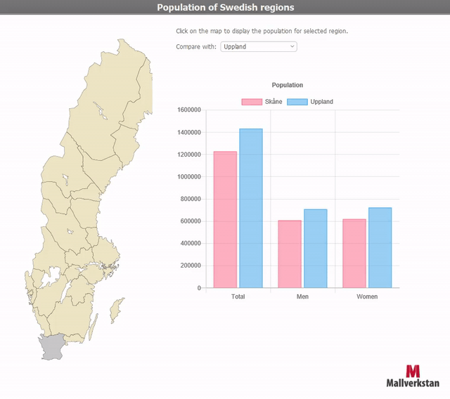 Ett annat exempel är en klickbar Sverige-karta som visar befolkningsmängd i diagram. Både kartan och diagrammet är webbvisare.